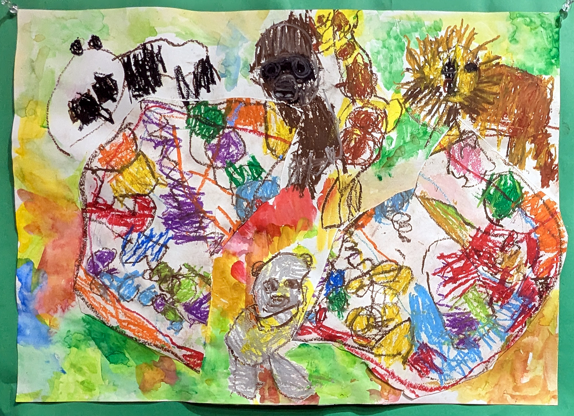 図鑑を見ながら、卵から動物が出てくる絵を描きました。ライオンの目をかっこよくすることと、絵の具を混ぜて色をぬることを工夫しました。