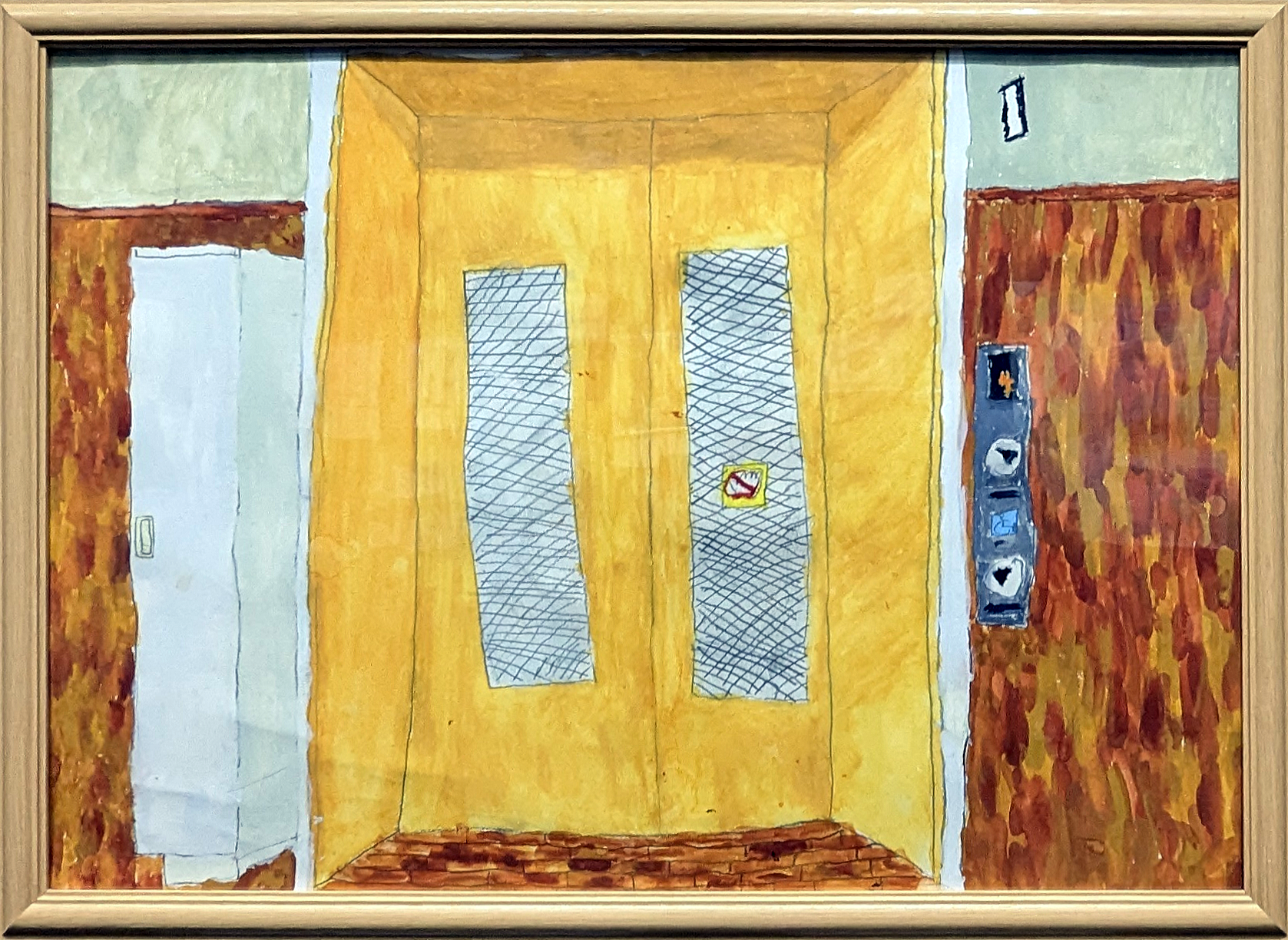 毎日使っているエレベーターをリアルに描けるように、絵の具のぬり方と色のまぜ方を工夫しました。定規を使わず直線を描くのをがんばりました。