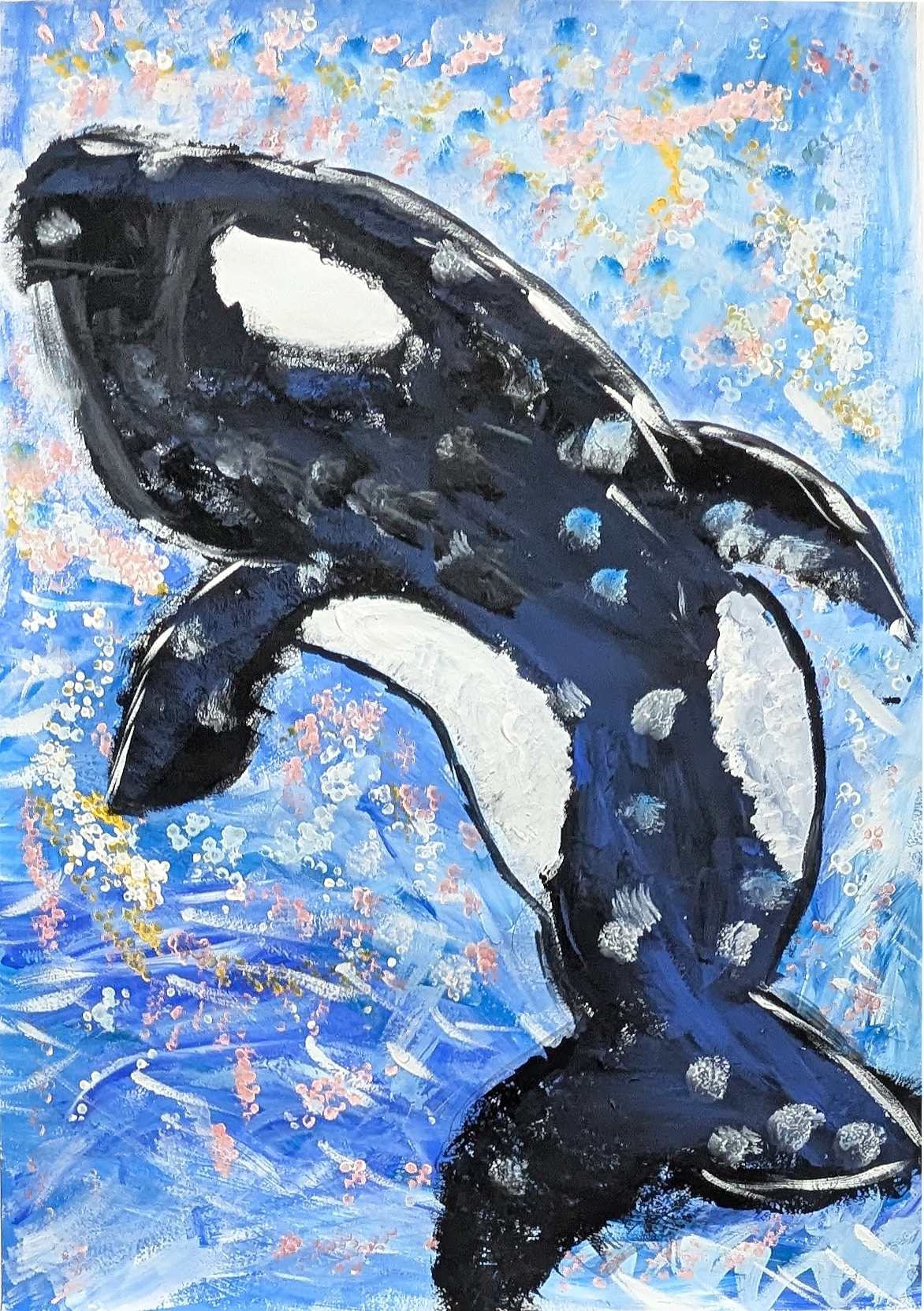 目の前で見たオルカのジャンプの迫力と驚きを絵にしました。オルカの勢いと空と水との背景を思いのまま描きました。特に背景は、筆と綿棒を使い工夫しました。