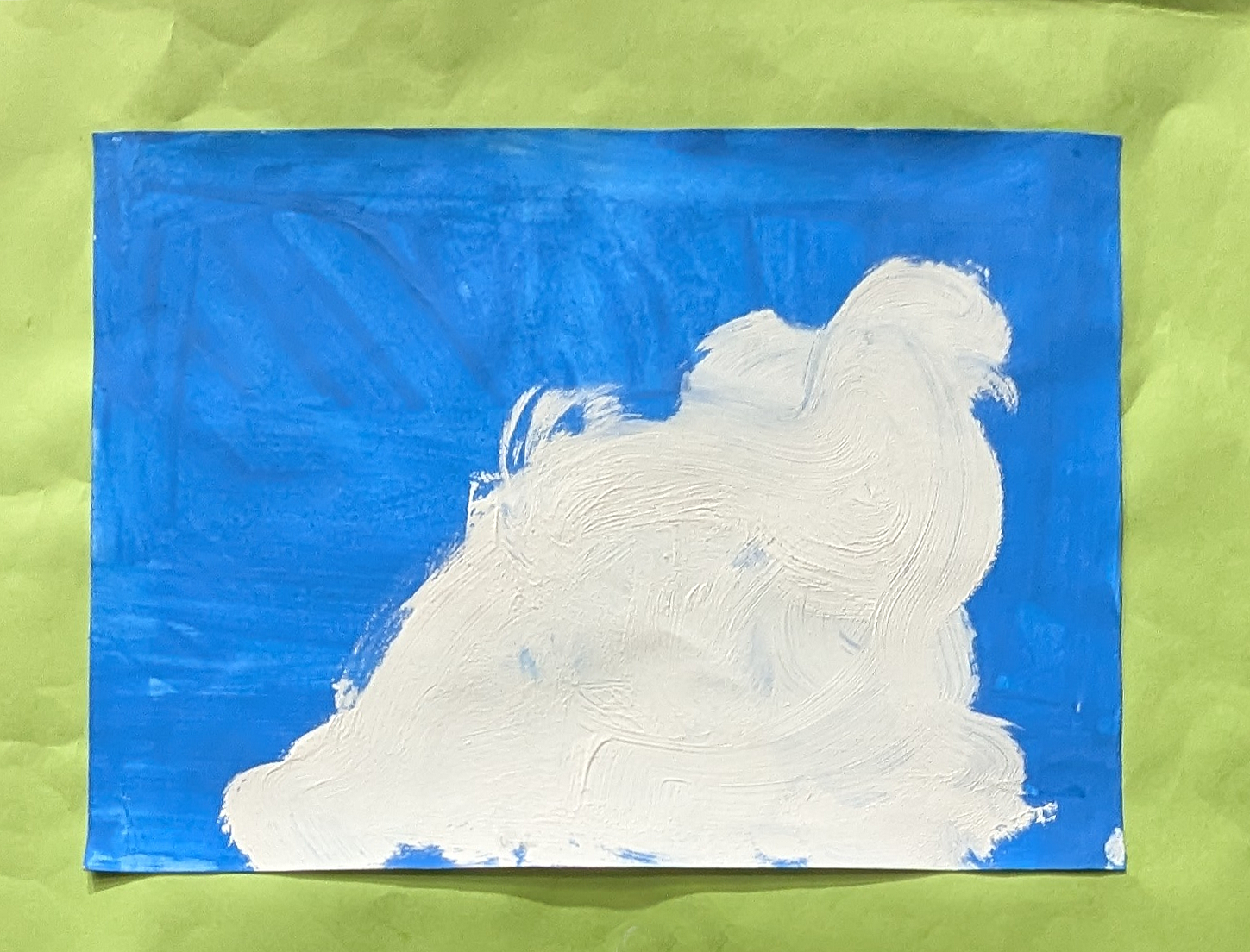白い絵の具を大きく動かして、入道雲の力強さを表しました。色を選ぶところから最後まで、自分の思いを空いっぱいに広げました。
